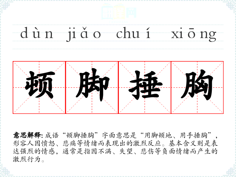 成语“顿脚捶胸”字面意思是“用脚顿地、用手捶胸”,形容人因愤怒、悲痛等情绪而表现出的激烈反应。基本含义则是表达强烈的情感,通常是指因不满、失望、悲伤等负面情绪而产生的激烈行为。