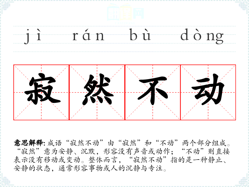 成语“寂然不动”由“寂然”和“不动”两个部分组成。“寂然”意为安静、沉默,形容没有声音或动作;“不动”则直接表示没有移动或变动。整体而言,“寂然不动”指的是一种静止、安静的状态,通常形容事物或人的沉静与专注。