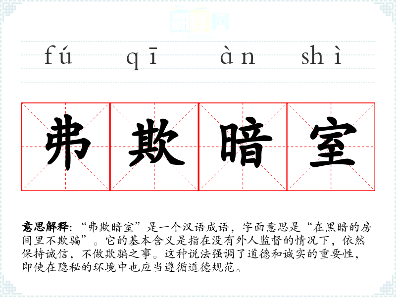 在英语中,有类似的表达方式,如“Integrity is doing the right thing, even when no one is watching.”(诚信就是在没有人监督时也做正确的事)。这与“弗欺暗室”的内涵相似,都强调了道德自律和诚实的重要性。