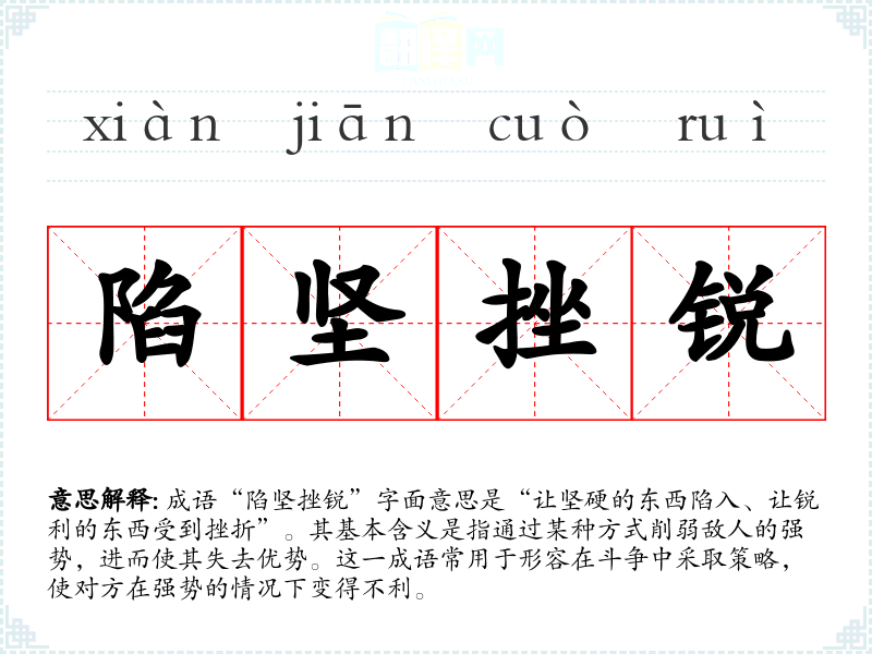 成语“陷坚挫锐”字面意思是“让坚硬的东西陷入、让锐利的东西受到挫折”。其基本含义是指通过某种方式削弱敌人的强势,进而使其失去优势。这一成语常用于形容在斗争中采取策略,使对方在强势的情况下变得不利。