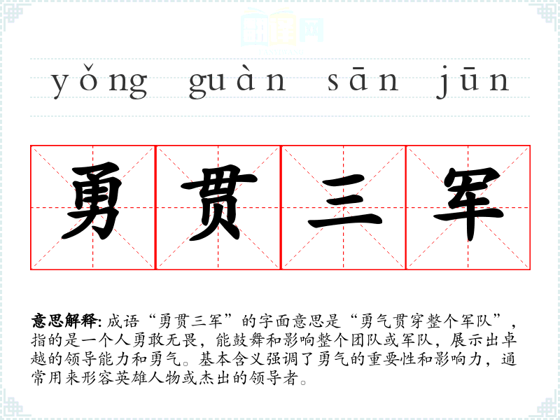 成语“勇贯三军”的字面意思是“勇气贯穿整个军队”,指的是一个人勇敢无畏,能鼓舞和影响整个团队或军队,展示出卓越的领导能力和勇气。基本含义强调了勇气的重要性和影响力,通常用来形容英雄人物或杰出的领导者。