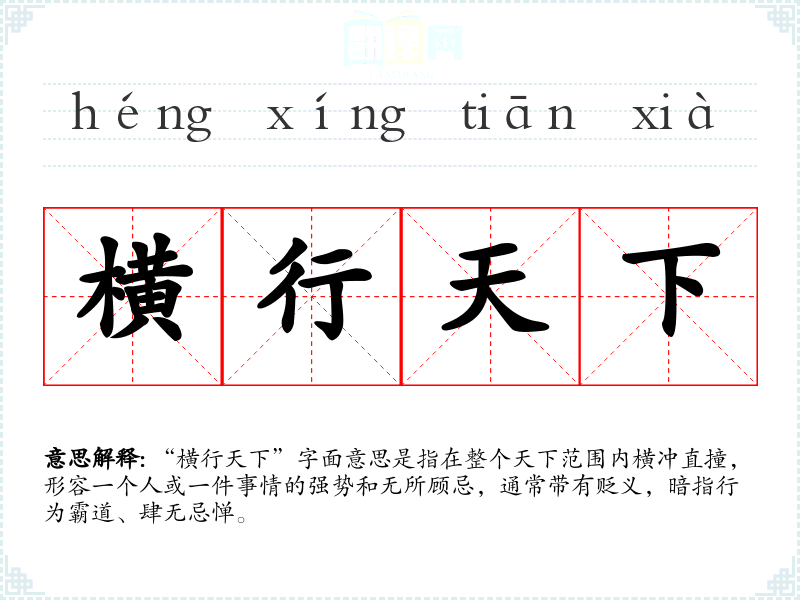 “横行天下”字面意思是指在整个天下范围内横冲直撞,形容一个人或一件事情的强势和无所顾忌,通常带有贬义,暗指行为霸道、肆无忌惮。