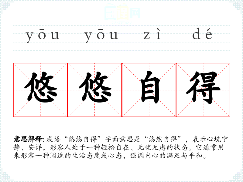 成语“悠悠自得”字面意思是“悠然自得”,表示心境宁静、安详,形容人处于一种轻松自在、无忧无虑的状态。它通常用来形容一种闲适的生活态度或心态,强调内心的满足与平和。
