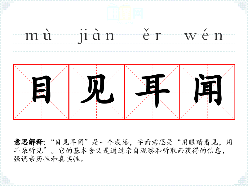 “目见耳闻”是一个成语,字面意思是“用眼睛看见,用耳朵听见”。它的基本含义是通过亲自观察和听取而获得的信息,强调亲历性和真实性。