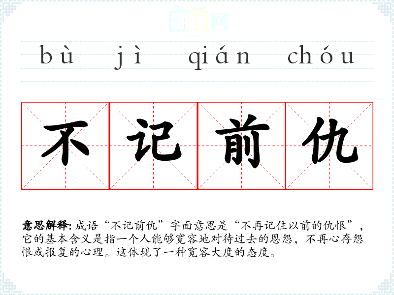 成语“不记前仇”字面意思是“不再记住以前的仇恨”,它的基本含义是指一个人能够宽容地对待过去的恩怨,不再心存怨恨或报复的心理。这体现了一种宽容大度的态度。