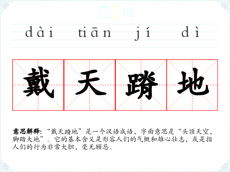 “戴天蹐地”是一个汉语成语,字面意思是“头顶天空,脚踏大地”。它的基本含义是形容人们的气概和雄心壮志,或是指人们的行为非常大胆,毫无顾忌。