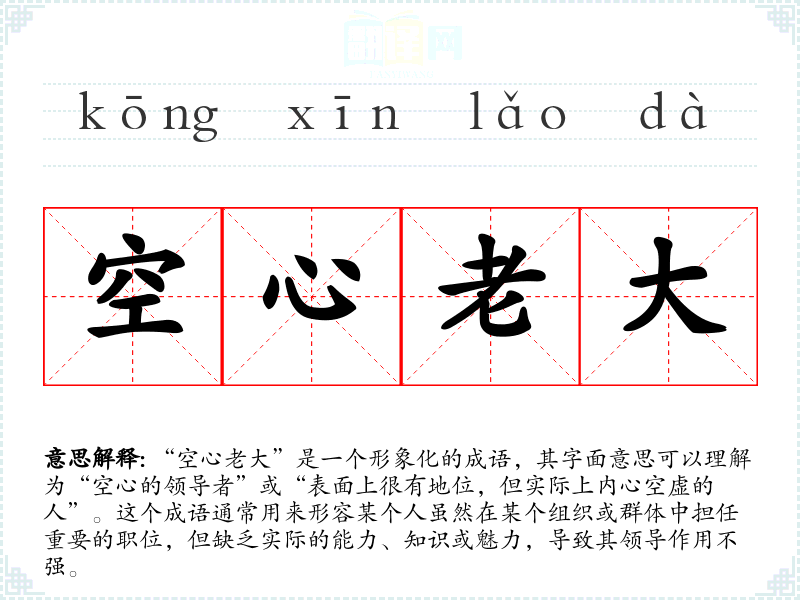 “空心老大”是一个形象化的成语,其字面意思可以理解为“空心的领导者”或“表面上很有地位,但实际上内心空虚的人”。这个成语通常用来形容某个人虽然在某个组织或群体中担任重要的职位,但缺乏实际的能力、知识或魅力,导致其领导作用不强。