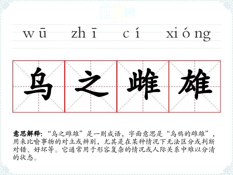 “乌之雌雄”是一则成语,字面意思是“乌鸦的雌雄”,用来比喻事物的对立或辨别,尤其是在某种情况下无法区分或判断对错、好坏等。它通常用于形容复杂的情况或人际关系中难以分清的状态。