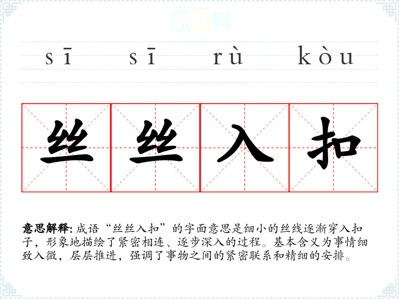 成语“丝丝入扣”的字面意思是细小的丝线逐渐穿入扣子,形象地描绘了紧密相连、逐步深入的过程。基本含义为事情细致入微,层层推进,强调了事物之间的紧密联系和精细的安排。