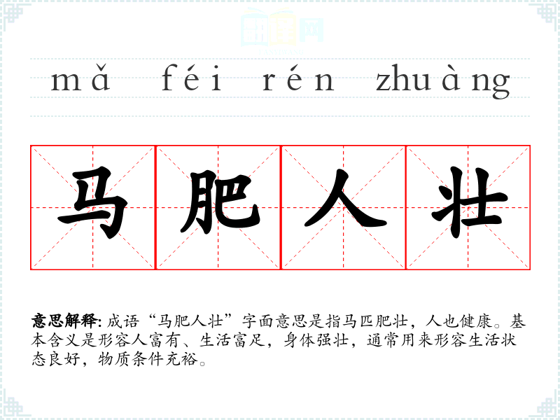 成语“马肥人壮”字面意思是指马匹肥壮,人也健康。基本含义是形容人富有、生活富足,身体强壮,通常用来形容生活状态良好,物质条件充裕。