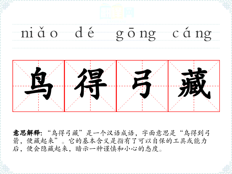 “鸟得弓藏”是一个汉语成语,字面意思是“鸟得到弓箭,便藏起来”。它的基本含义是指有了可以自保的工具或能力后,便会隐藏起来,暗示一种谨慎和小心的态度。