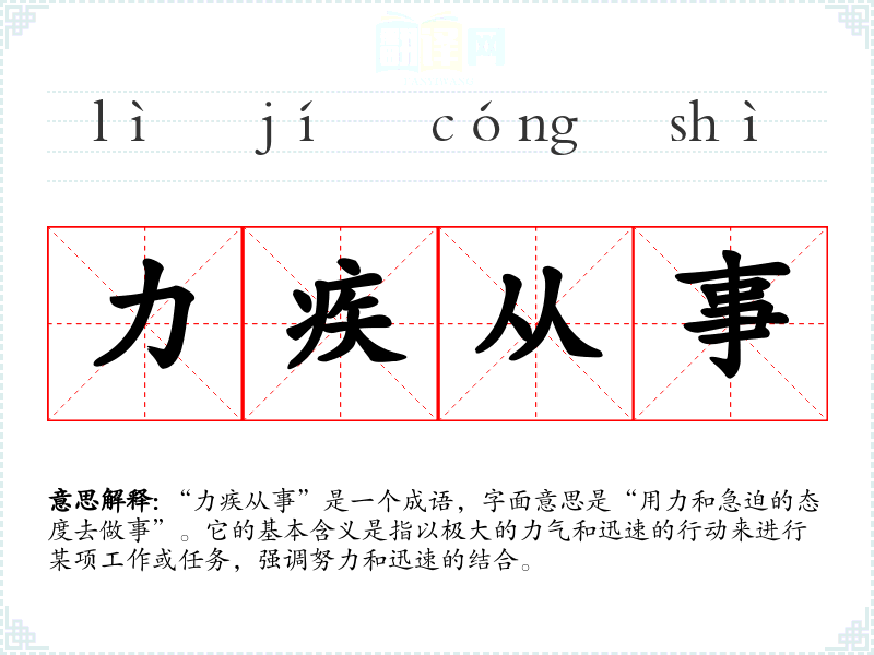 “力疾从事”是一个成语,字面意思是“用力和急迫的态度去做事”。它的基本含义是指以极大的力气和迅速的行动来进行某项工作或任务,强调努力和迅速的结合。
