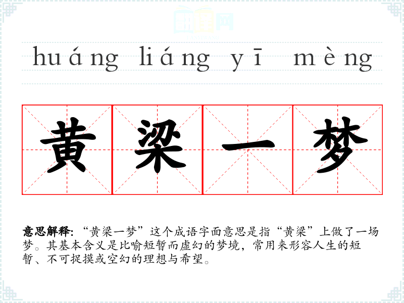“黄梁一梦”这个成语字面意思是指“黄梁”上做了一场梦。其基本含义是比喻短暂而虚幻的梦境,常用来形容人生的短暂、不可捉摸或空幻的理想与希望。