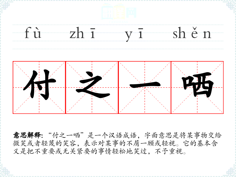 “付之一哂”是一个汉语成语,字面意思是将某事物交给微笑或者轻蔑的笑容,表示对某事的不屑一顾或轻视。它的基本含义是把不重要或无关紧要的事情轻松地笑过,不予重视。