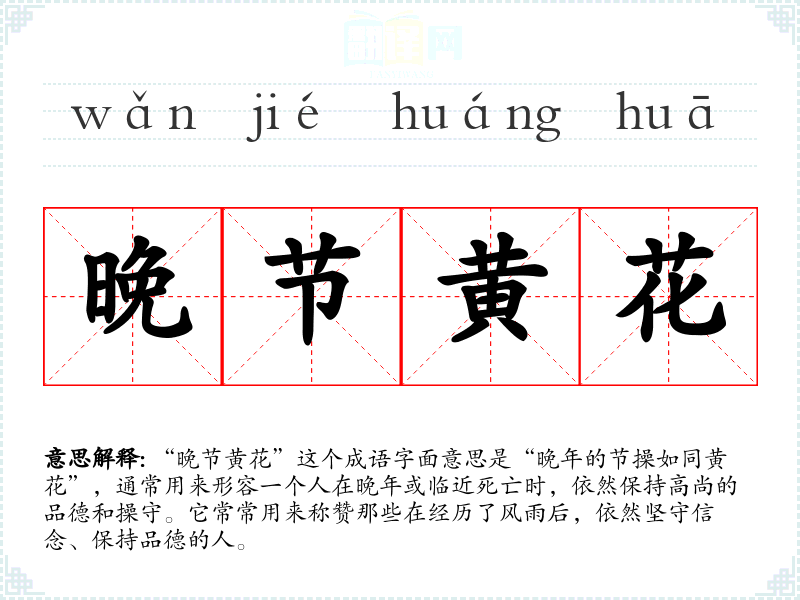 “晚节黄花”这个成语字面意思是“晚年的节操如同黄花”,通常用来形容一个人在晚年或临近死亡时,依然保持高尚的品德和操守。它常常用来称赞那些在经历了风雨后,依然坚守信念、保持品德的人。