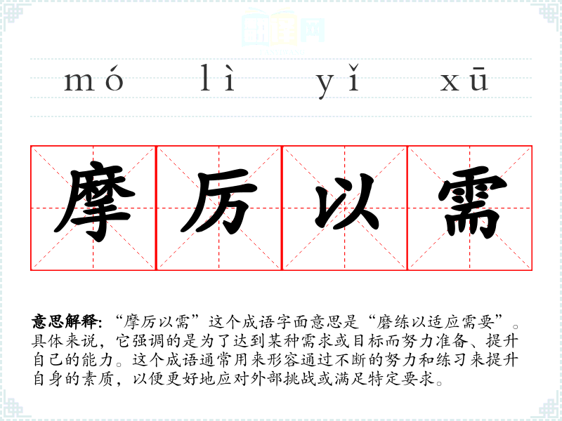 “摩厉以需”这个成语字面意思是“磨练以适应需要”。具体来说,它强调的是为了达到某种需求或目标而努力准备、提升自己的能力。这个成语通常用来形容通过不断的努力和练*来提升自身的素质,以便更好地应对外部挑战或满足特定要求。