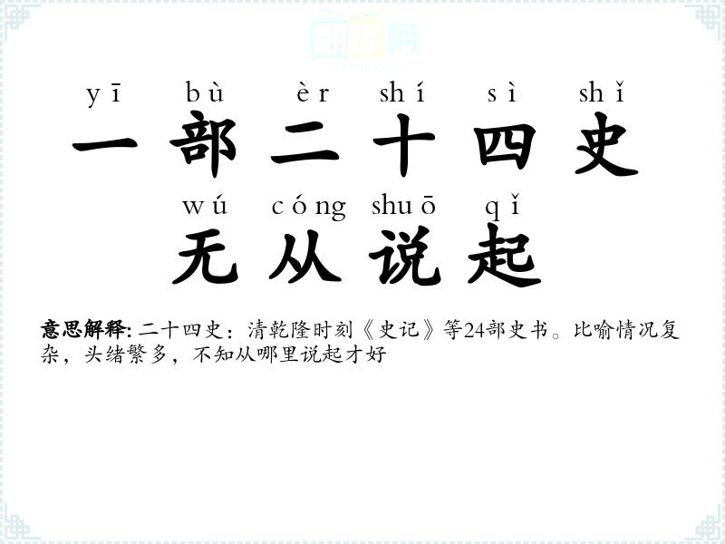 二十四史:清乾隆时刻《史记》等24部史书。比喻情况复杂,头绪繁多,不知从哪里说起才好 |