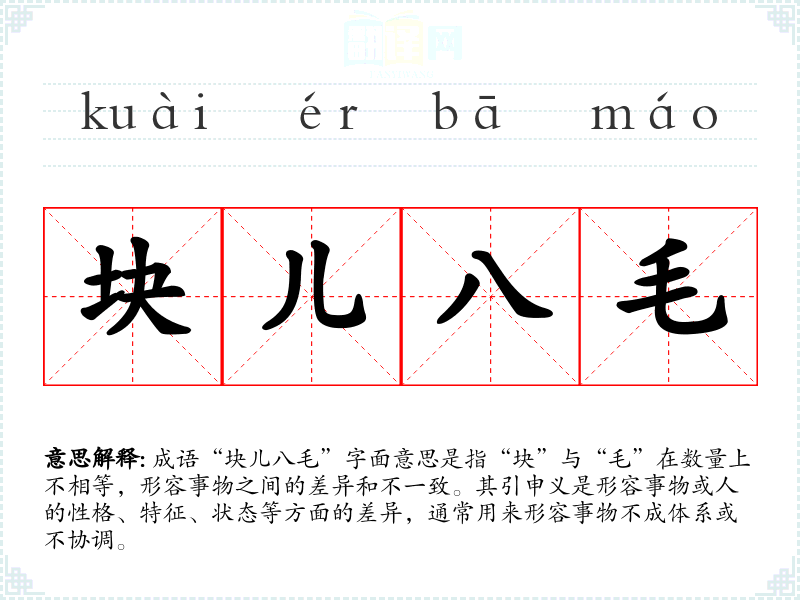 成语“块儿八毛”字面意思是指“块”与“毛”在数量上不相等,形容事物之间的差异和不一致。其引申义是形容事物或人的性格、特征、状态等方面的差异,通常用来形容事物不成体系或不协调。