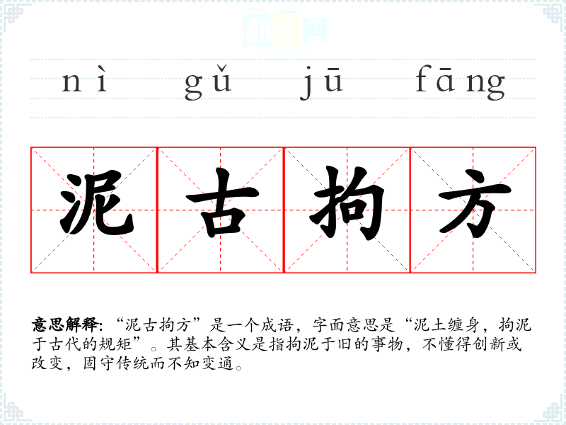 “泥古拘方”是一个成语,字面意思是“泥土缠身,拘泥于古代的规矩”。其基本含义是指拘泥于旧的事物,不懂得创新或改变,固守传统而不知变通。
