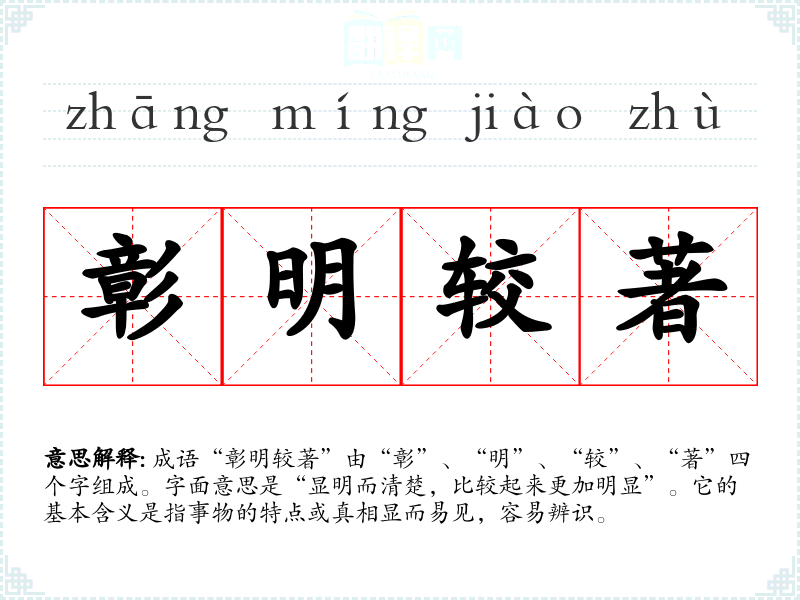 成语“彰明较著”由“彰”、“明”、“较”、“著”四个字组成。字面意思是“显明而清楚,比较起来更加明显”。它的基本含义是指事物的特点或真相显而易见,容易辨识。