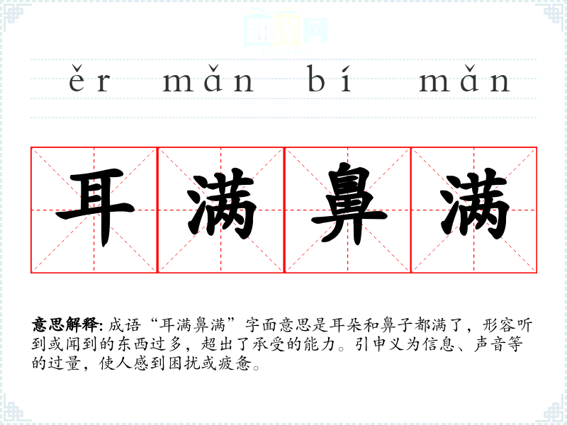 成语“耳满鼻满”字面意思是耳朵和鼻子都满了,形容听到或闻到的东西过多,超出了承受的能力。引申义为信息、声音等的过量,使人感到困扰或疲惫。