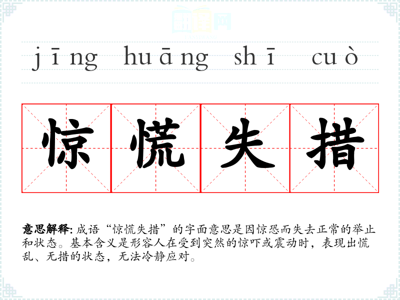 成语“惊慌失措”的字面意思是因惊恐而失去正常的举止和状态。基本含义是形容人在受到突然的惊吓或震动时,表现出慌乱、无措的状态,无法冷静应对。