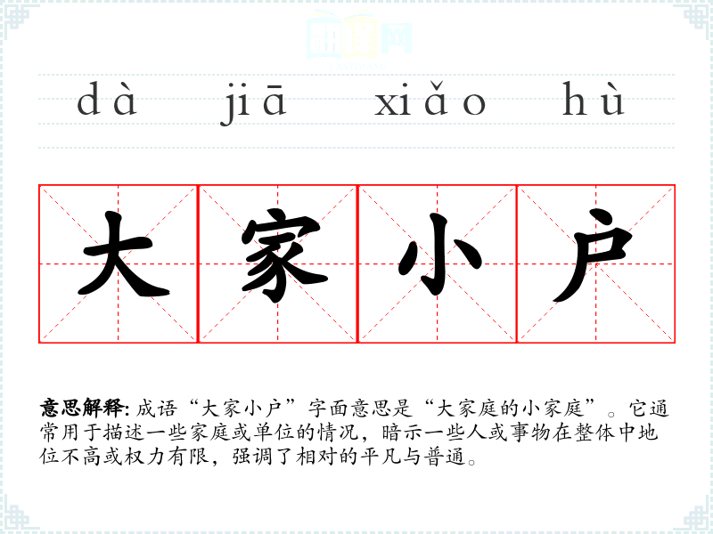 成语“大家小户”字面意思是“大家庭的小家庭”。它通常用于描述一些家庭或单位的情况,暗示一些人或事物在整体中地位不高或权力有限,强调了相对的平凡与普通。