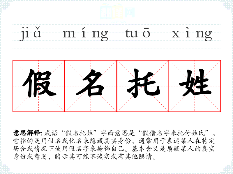 成语“假名托姓”字面意思是“假借名字来托付姓氏”。它指的是用假名或化名来隐藏真实身份,通常用于表述某人在特定场合或情况下使用假名字来掩饰自己。基本含义是质疑某人的真实身份或意图,暗示其可能不诚实或有其他隐情。