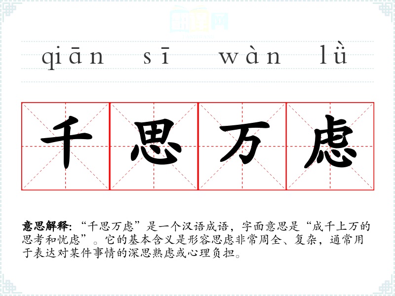 “千思万虑”是一个汉语成语,字面意思是“成千上万的思考和忧虑”。它的基本含义是形容思虑非常周全、复杂,通常用于表达对某件事情的深思熟虑或心理负担。