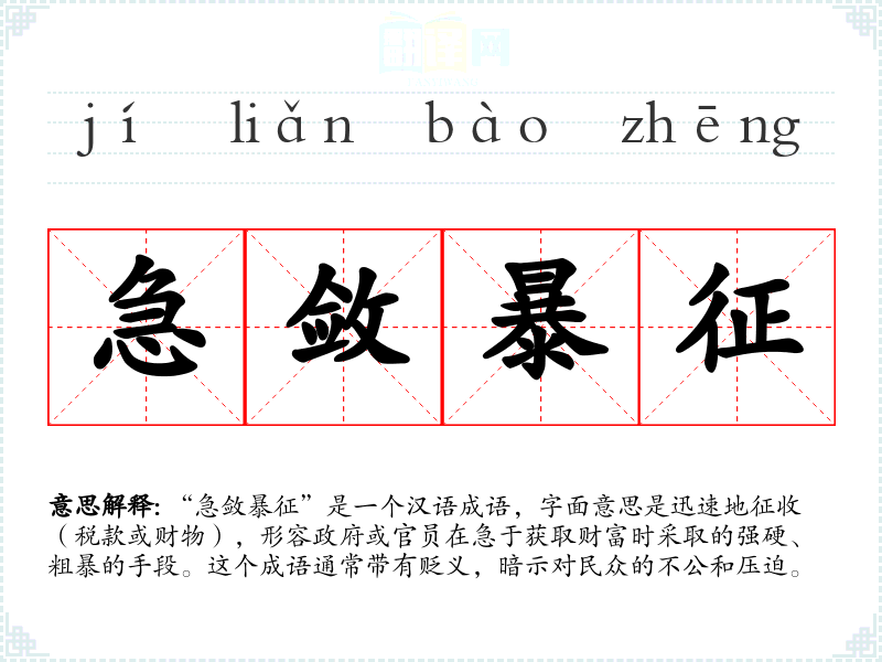 成语“急敛暴征”并没有明确的历史典故或文学出处,但其反映的情景在**历史上屡见不鲜。古代的封建社会中,官府为了满足财政需求,常常采取急功近利的方式进行征税,结果造成了民众的极大不满与反抗。这一成语因此在现代语境中也被广泛使用,特别是在讨论政府行为或经济政策时。