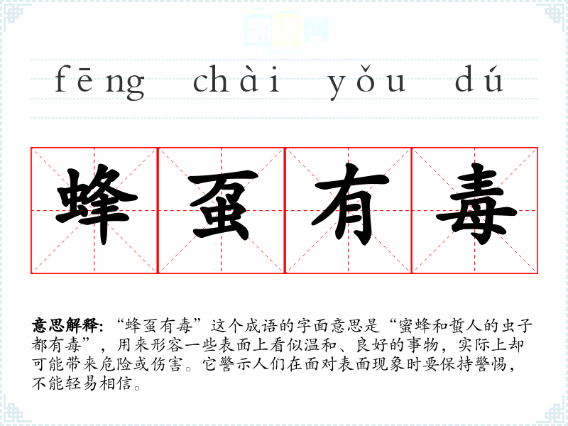 “蜂虿有毒”这个成语的字面意思是“蜜蜂和蜇人的虫子都有毒”,用来形容一些表面上看似温和、良好的事物,实际上却可能带来危险或伤害。它警示人们在面对表面现象时要保持警惕,不能轻易相信。