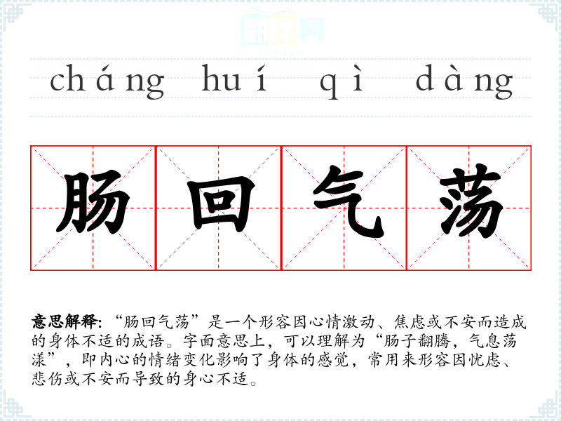 “肠回气荡”是一个形容因心情激动、焦虑或不安而造成的身体不适的成语。字面意思上,可以理解为“肠子翻腾,气息荡漾”,即内心的情绪变化影响了身体的感觉,常用来形容因忧虑、悲伤或不安而导致的身心不适。