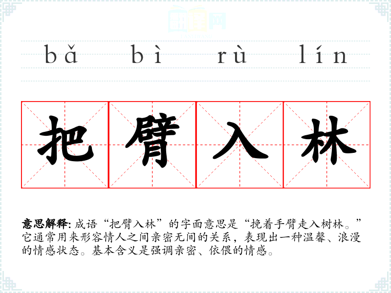 成语“把臂入林”的字面意思是“挽着手臂走入树林。”它通常用来形容情人之间亲密无间的关系,表现出一种温馨、浪漫的情感状态。基本含义是强调亲密、依偎的情感。