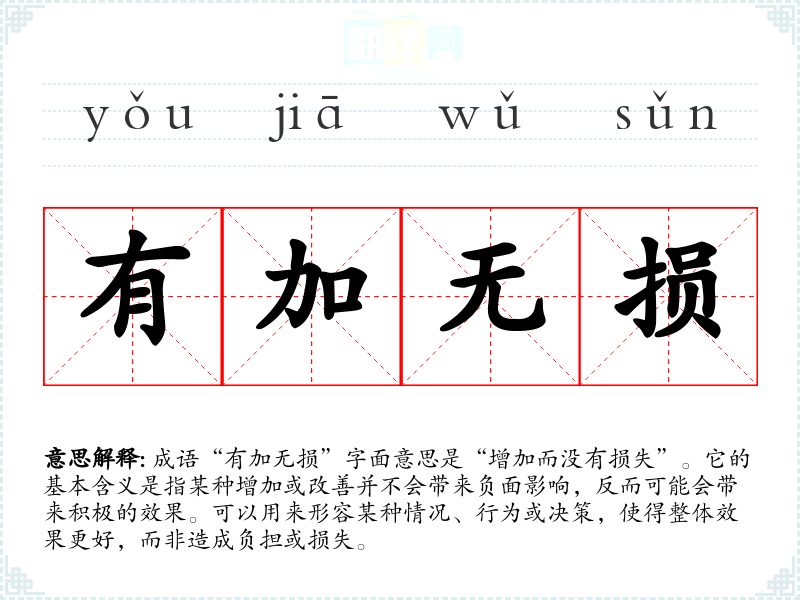 成语“有加无损”字面意思是“增加而没有损失”。它的基本含义是指某种增加或改善并不会带来负面影响,反而可能会带来积极的效果。可以用来形容某种情况、行为或决策,使得整体效果更好,而非造成负担或损失。