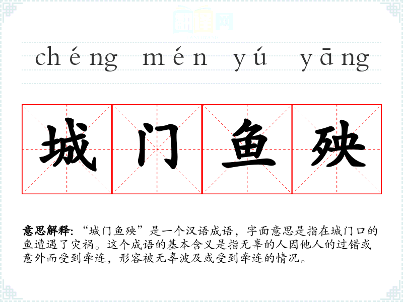 “城门鱼殃”是一个汉语成语,字面意思是指在城门口的鱼遭遇了灾祸。这个成语的基本含义是指无辜的人因他人的过错或意外而受到牵连,形容被无辜波及或受到牵连的情况。