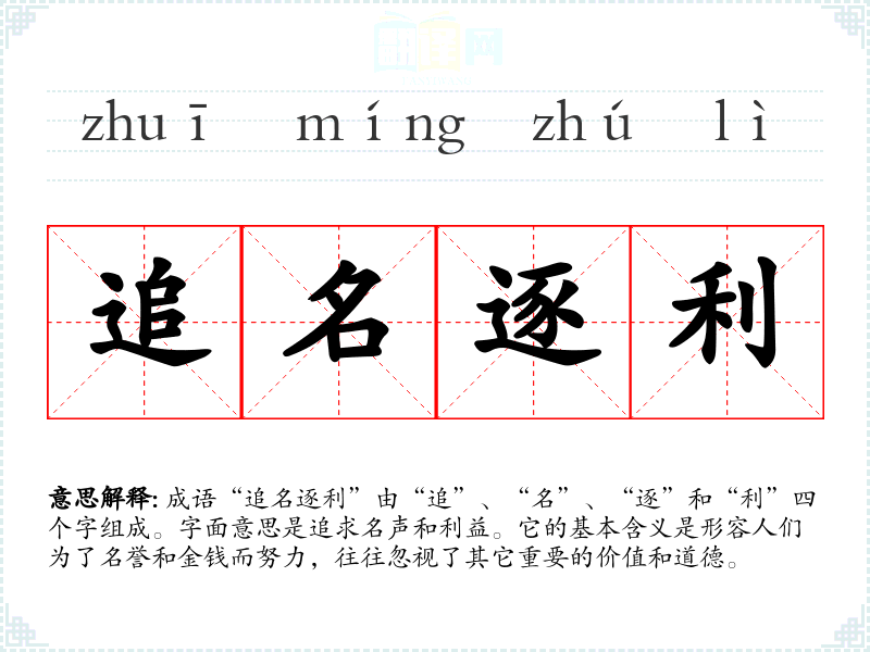 成语“追名逐利”由“追”、“名”、“逐”和“利”四个字组成。字面意思是追求名声和利益。它的基本含义是形容人们为了名誉和金钱而努力,往往忽视了其它重要的价值和道德。