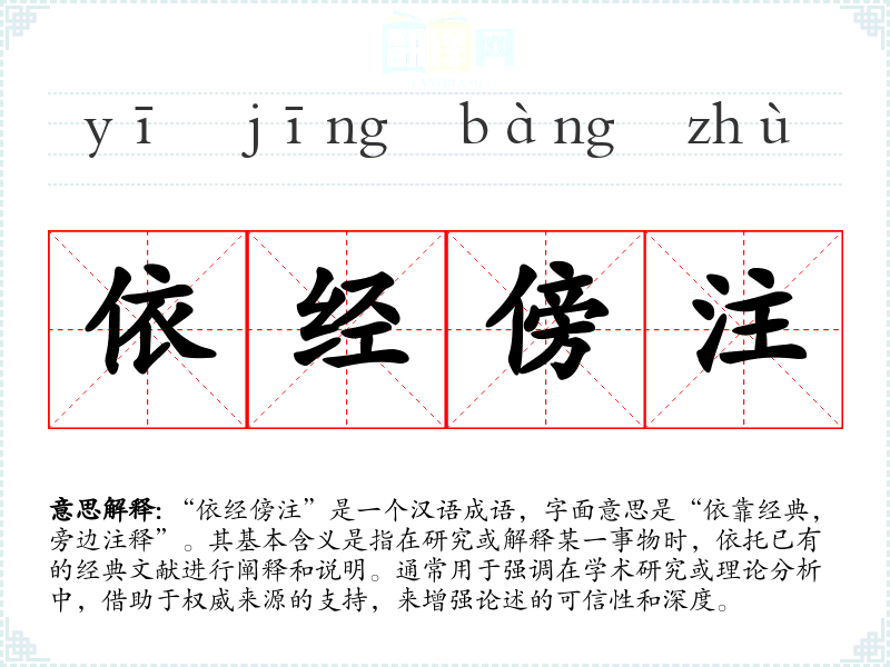 “依经傍注”是一个汉语成语,字面意思是“依靠经典,旁边注释”。其基本含义是指在研究或解释某一事物时,依托已有的经典文献进行阐释和说明。通常用于强调在学术研究或理论分析中,借助于权威来源的支持,来增强论述的可信性和深度。