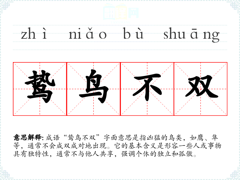 成语“鸷鸟不双”字面意思是指凶猛的鸟类,如鹰、隼等,通常不会成双成对地出现。它的基本含义是形容一些人或事物具有独特性,通常不与他人共享,强调个体的独立和孤傲。
