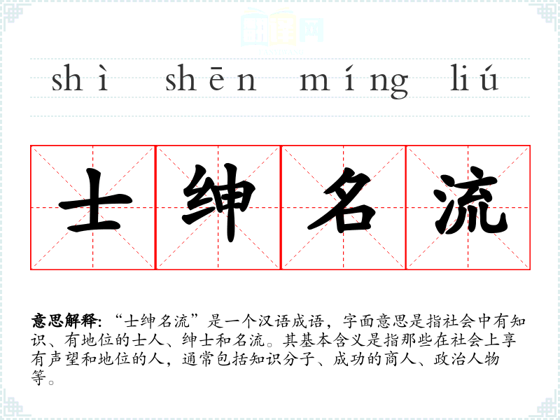 “士绅名流”是一个汉语成语,字面意思是指社会中有知识、有地位的士人、绅士和名流。其基本含义是指那些在社会上享有声望和地位的人,通常包括知识分子、成功的商人、政治人物等。
