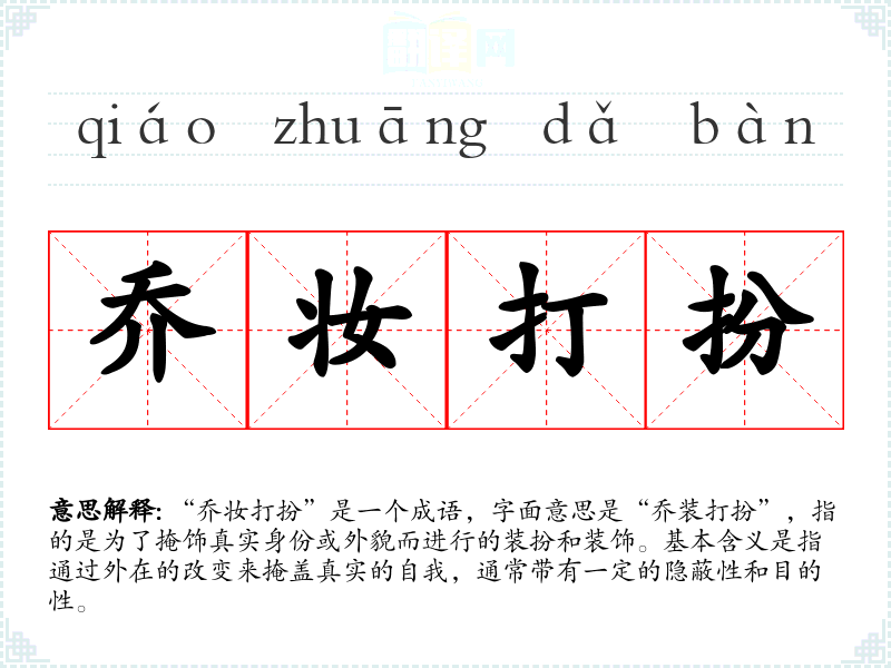 “乔妆打扮”是一个成语,字面意思是“乔装打扮”,指的是为了掩饰真实身份或外貌而进行的装扮和装饰。基本含义是指通过外在的改变来掩盖真实的自我,通常带有一定的隐蔽性和目的性。