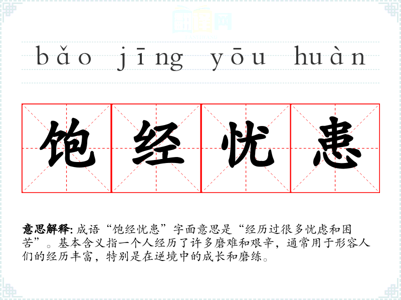 成语“饱经忧患”字面意思是“经历过很多忧虑和困苦”。基本含义指一个人经历了许多磨难和艰辛,通常用于形容人们的经历丰富,特别是在逆境中的成长和磨练。