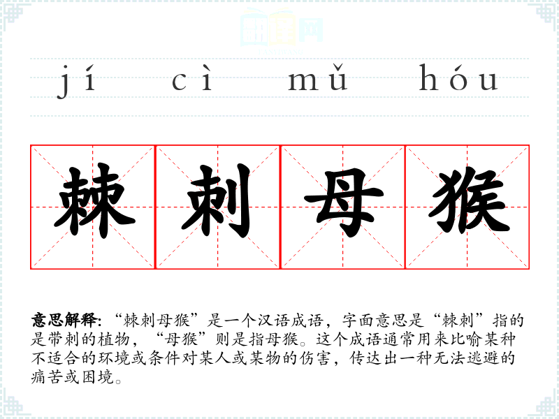 “棘刺母猴”是一个汉语成语,字面意思是“棘刺”指的是带刺的植物,“母猴”则是指母猴。这个成语通常用来比喻某种不适合的环境或条件对某人或某物的伤害,传达出一种无法逃避的痛苦或困境。