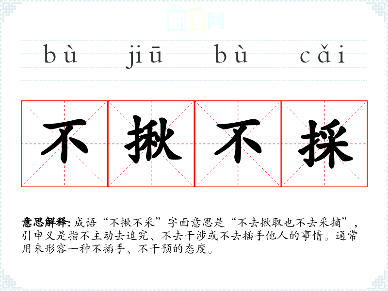 成语“不揪不采”字面意思是“不去揪取也不去采摘”,引申义是指不主动去追究、不去干涉或不去插手他人的事情。通常用来形容一种不插手、不干预的态度。