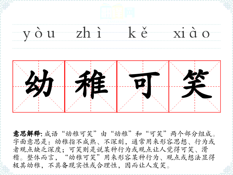 成语“幼稚可笑”由“幼稚”和“可笑”两个部分组成。字面意思是:幼稚指不成熟、不深刻,通常用来形容思想、行为或者观点缺乏深度;可笑则是说某种行为或观点让人觉得可笑、滑稽。整体而言,“幼稚可笑”用来形容某种行为、观点或想法显得极其幼稚,不具备现实性或合理性,因而让人发笑。