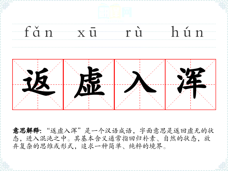 “返虚入浑”是一个汉语成语,字面意思是返回虚无的状态,进入混沌之中。其基本含义通常指回归朴素、自然的状态,放弃复杂的思维或形式,追求一种简单、纯粹的境界。