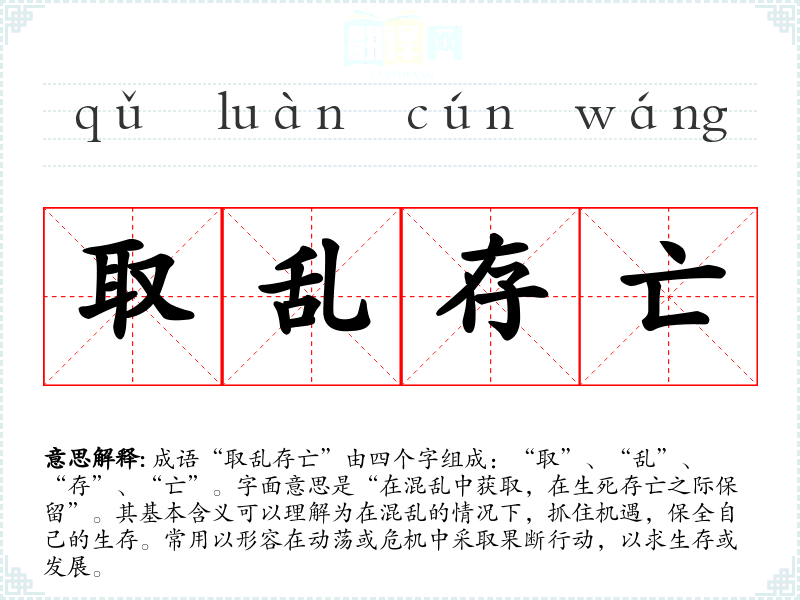 成语“取乱存亡”由四个字组成:“取”、“乱”、“存”、“亡”。字面意思是“在混乱中获取,在生死存亡之际保留”。其基本含义可以理解为在混乱的情况下,抓住机遇,保全自己的生存。常用以形容在动荡或危机中采取果断行动,以求生存或发展。