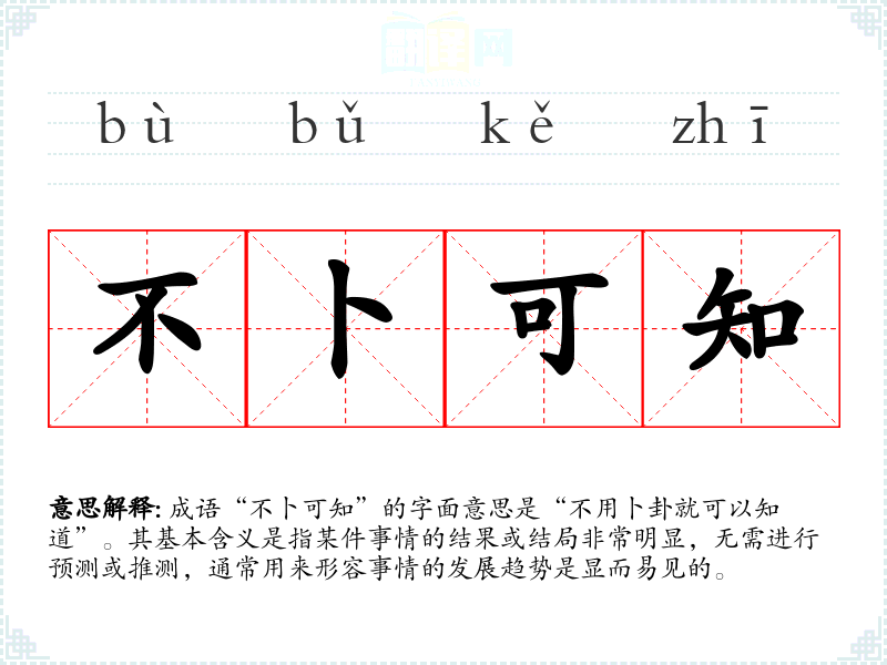 成语“不卜可知”的字面意思是“不用卜卦就可以知道”。其基本含义是指某件事情的结果或结局非常明显,无需进行预测或推测,通常用来形容事情的发展趋势是显而易见的。