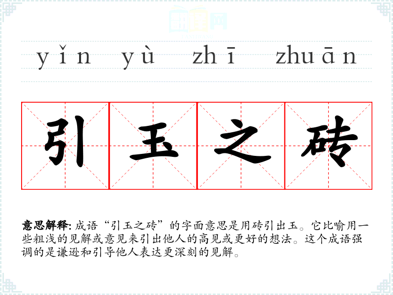 成语“引玉之砖”的字面意思是用砖引出玉。它比喻用一些粗浅的见解或意见来引出他人的高见或更好的想法。这个成语强调的是谦逊和引导他人表达更深刻的见解。