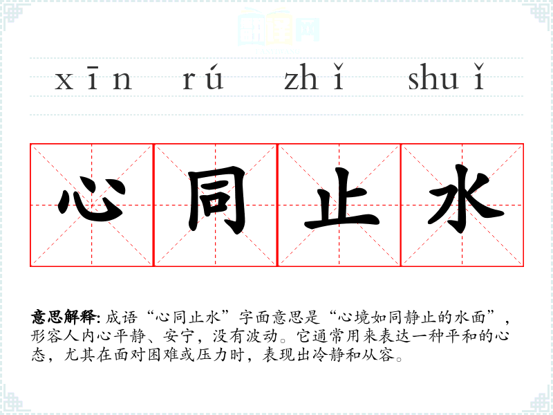 成语“心同止水”字面意思是“心境如同静止的水面”,形容人内心平静、安宁,没有波动。它通常用来表达一种平和的心态,尤其在面对困难或压力时,表现出冷静和从容。