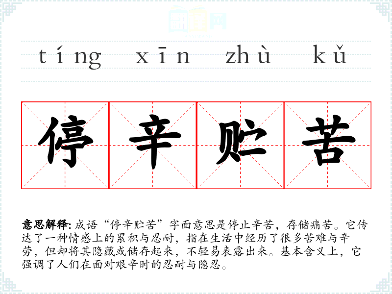 | 停辛伫苦 | 停:止息,停留;伫:贮积。辛劳长期缠身。形容经历了不少艰难困苦。 |